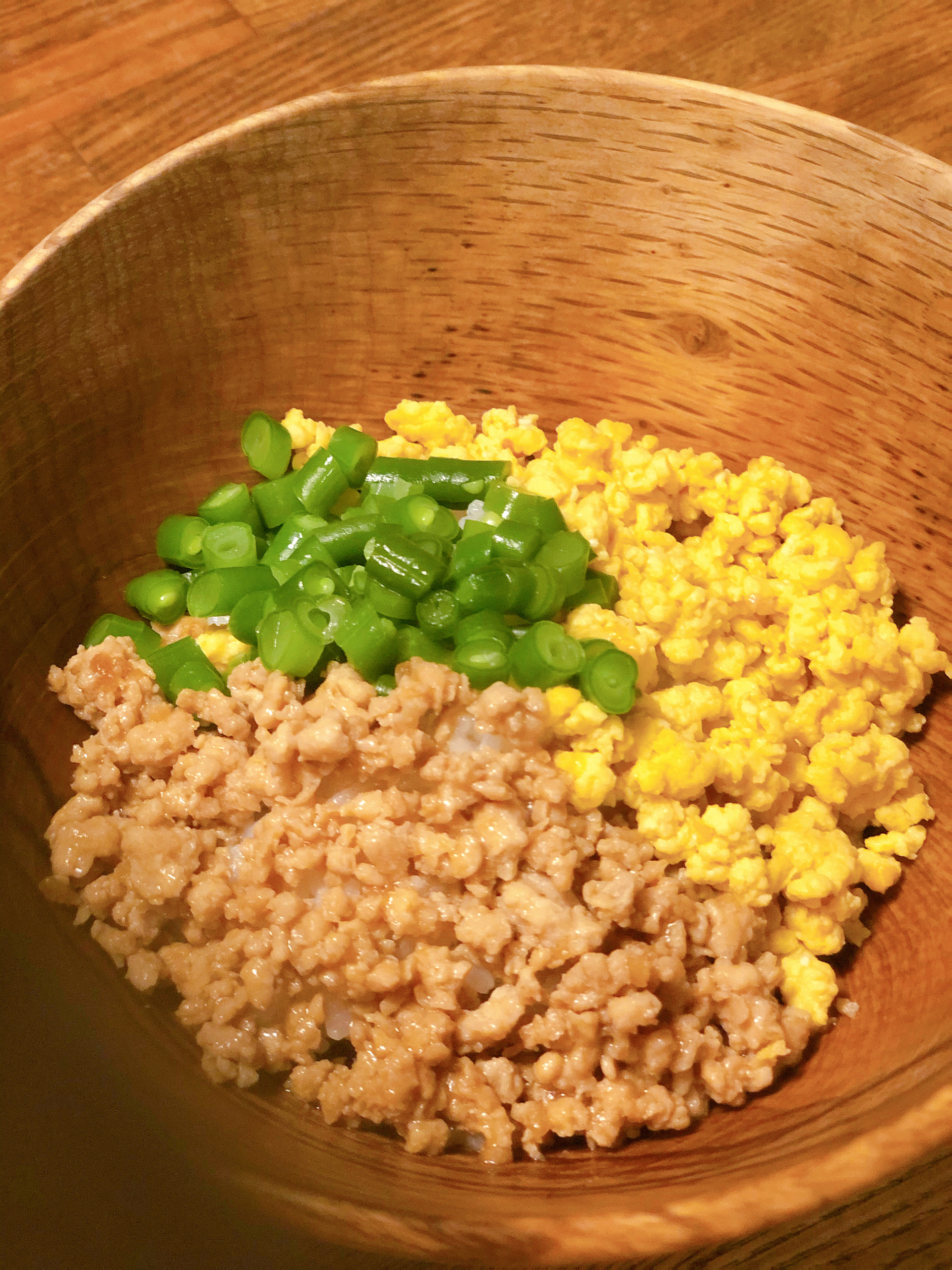 鶏そぼろに卵そぼろ、それに緑のものが加わった丼は、大抵「わー」っと歓迎される。