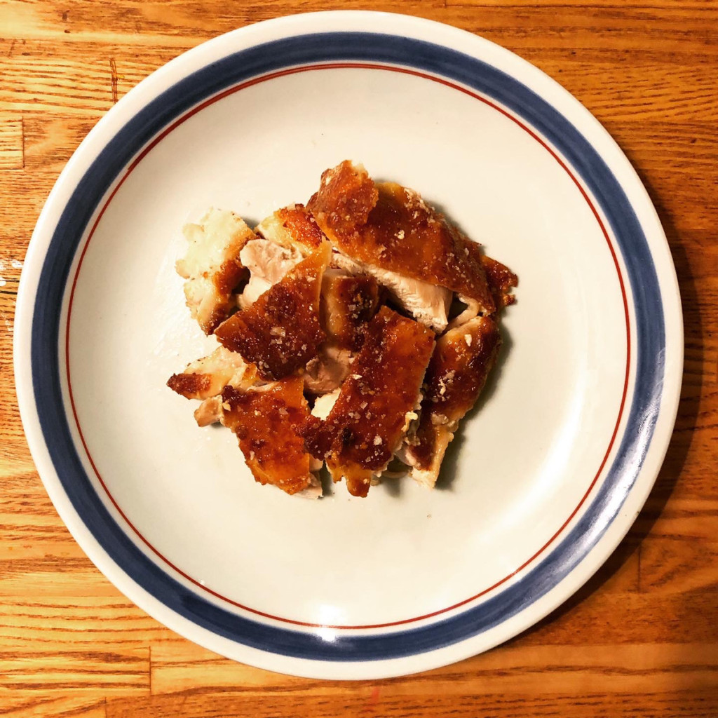 鶏モモ肉に軽く包丁を入れ、厚みを均等にする。オリーブオイルを多めに敷いたフライパンに皮目から焼き、弱火で30分くらいかけて火を入れる。