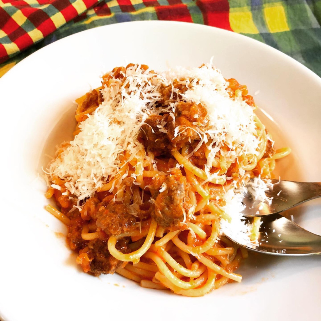 玉ねぎを炒めた鍋に肉を移す。フライパンの焦げ目が美味しいので水をカップ1/3位入れてこそげ落とし、それも鍋に入れる。トマト缶1缶を加えて煮詰める。全体がソースとして絡むくらいの水分量になるまで加熱する。(パスタを絡めた時に水分が出ない程度)←水分が多過ぎないのが重要