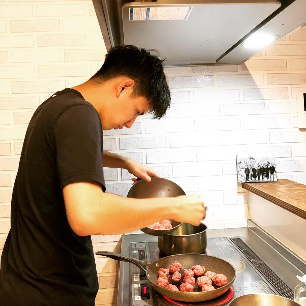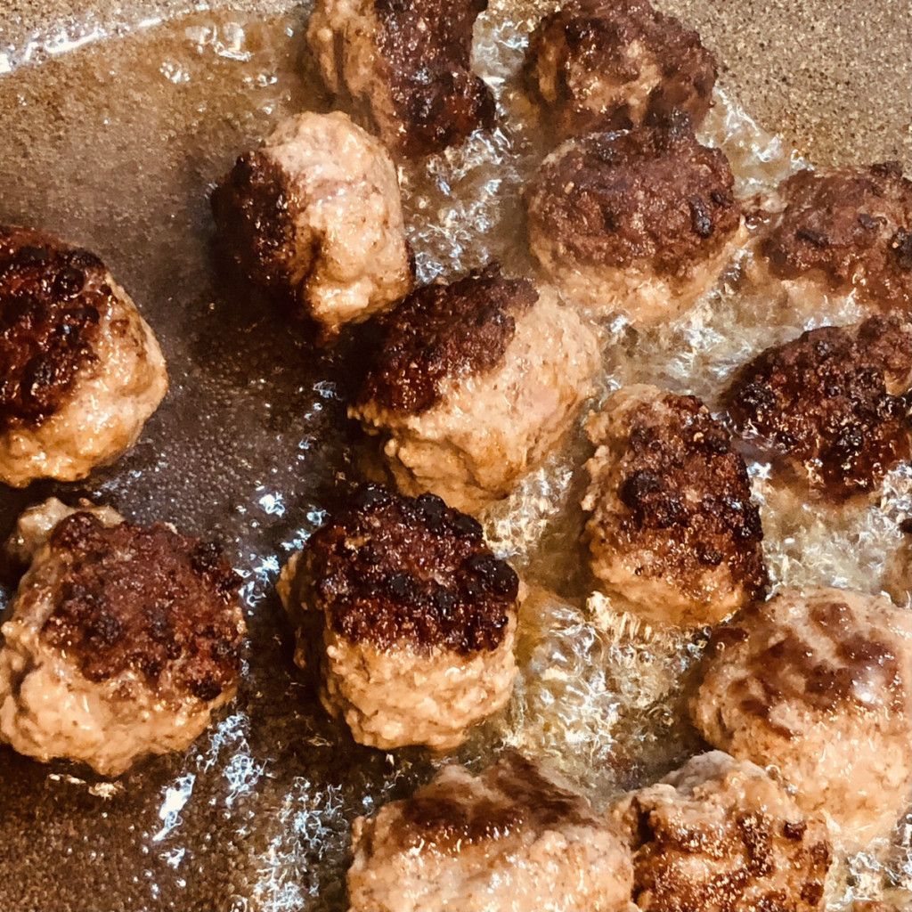 その間に合い挽き肉200gをボールに広げ、全体に行き渡るように塩胡椒をしよく練る。フライパンにオリーブオイルを入れて強火にかけ、ゴルフボールくらいの大きさに分けて丸め、蓋をせず焼く。大事なのはカリッとした焦げ目をある程度つけること。肉汁を閉じ込める。焼けたら肉を親指の爪くらいの大きさに少しだけ崩す。あくまでも「肉を食べる」ので崩し過ぎないのがポイント!